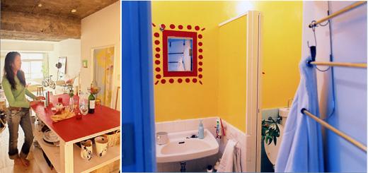 結局、Oさんは壁は白く塗ってもらい、天井はNYのロフトなどでよく見かけるような、むきだしの状態に、床は白木の板を自前で張った。「会社の夏休みを利用してひとりでのんびり、1週間をかけて床を張りました。と言っても実はこれホームセンターで買ってきた 板材をカットして並べてあるだけなんですよ。それでも結構雰囲気出て見えますよね」。バスルームの壁も自分で、お気に入りの黄色に塗った。