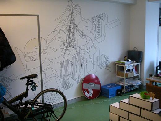 ロンドン留学から戻ってすぐここを借りたというassistantの場合は、向こうにいる時から東京R不動産HPをまめにチェックして、日本に戻ってすぐこの物件を見に来た。ロンドンのバートレット・スクールでアーキグラムのピーター・クックについて建築を学んだ後、現在東京で空間設計の仕事を行っている。社員は日本にいる3名に加え、ロンドン在住のコーディネイタースタッフ1名がおり、日本と海外の仕事をやりくりしているそうだ。彼らにしても自由な感覚の持ち主。特別な内装はしていないが、その代わり壁には「assistant」のロゴを大きくあしらった絵がペイントされている。「友人であるスウェーデン人のグラフィックデザイナーに描いてもらいました。出るときにはきちんと白く塗って返します」。この部屋はまるでNYのアーティストのアトリエみたいだ。