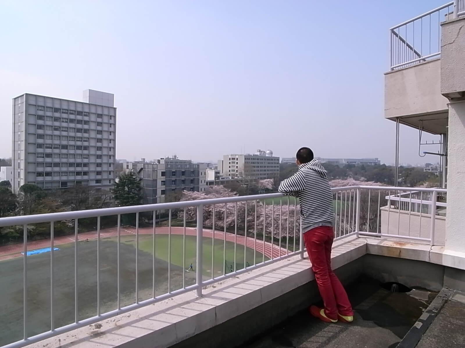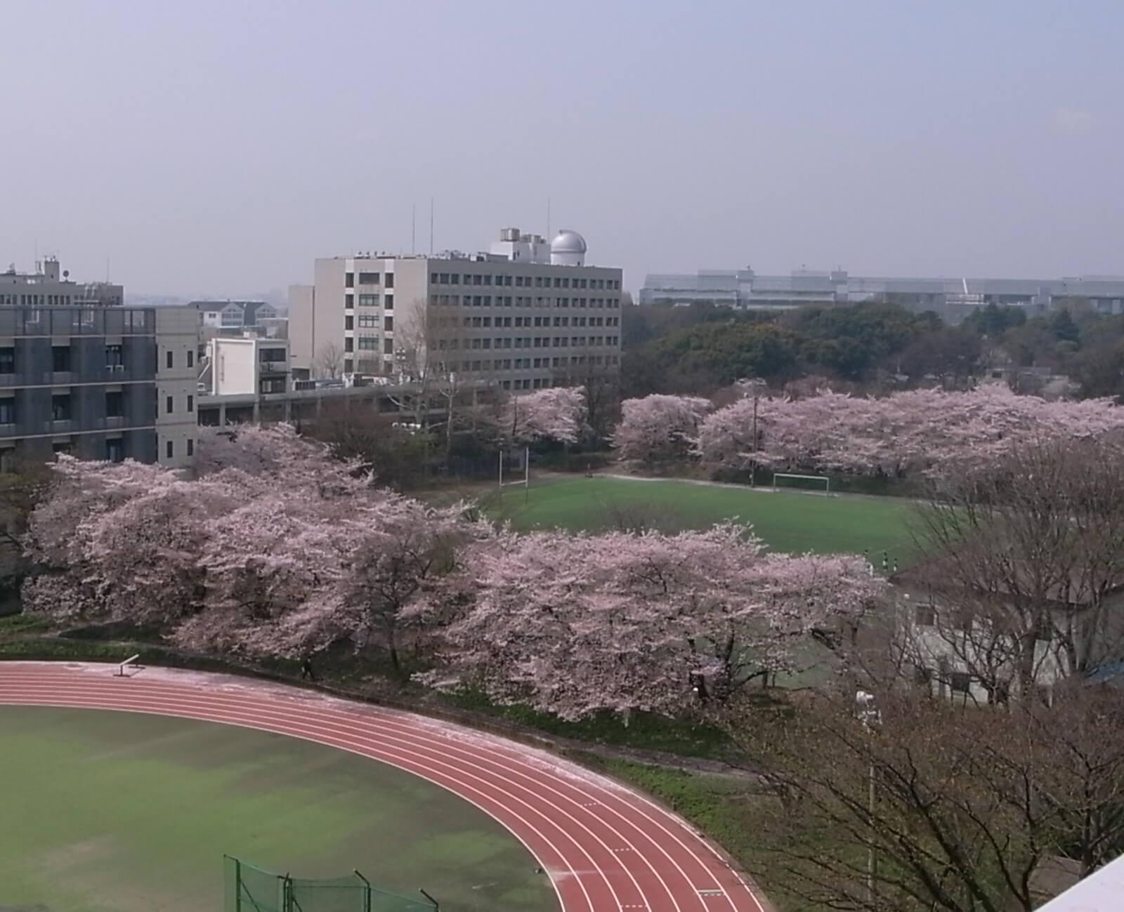 なぜこんな景色が目の前に広がっているのかというと、某大学のグランドの隣という立地ゆえ。春の訪れとともに、グランドを囲むように植えられている桜の木々が花を咲かせるのだ。