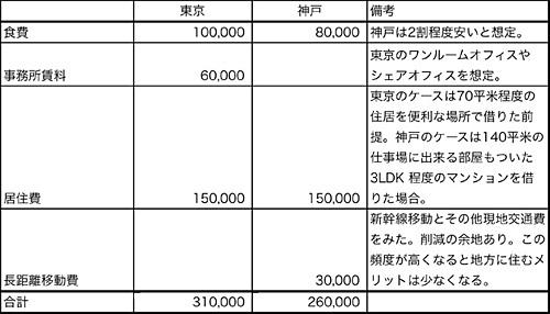 東京では70平米程度の住居に家族3人で暮らし、小さな事務所を1人で借りているという前提の人が、神戸の外国人マンション(間取りは140平米3LDKで東京の住居と同じ家賃と想定)に引越してきたと考えてみた。長距離移動の頻度が1ヶ月に1回などに下げられたり、長距離移動のコストを負担してもらえるのであれば神戸の方が安くつく。住処も広くて空気もきれいで、家族との時間やプライベートの時間が増やせる。