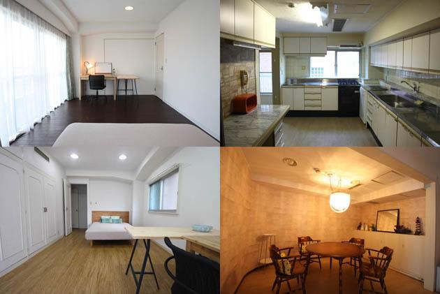 内部の様子。(左上)(左下)部屋はこんな感じ。各部屋14平米~16平米程度の大きさがある。(右上)大きなフルキッチン。(右下)ダイニング兼たまり場。