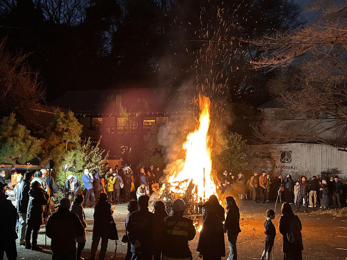緑の豊かな森に包まれるような簗田寺。この森を舞台にワークショップを行います夕方からは、正月飾りなどの縁起物のおたき上げをする「どんど焼き」があります。背丈よりもずっと大きいやぐらが燃え上がる様子は必見。