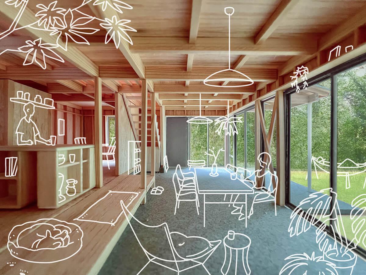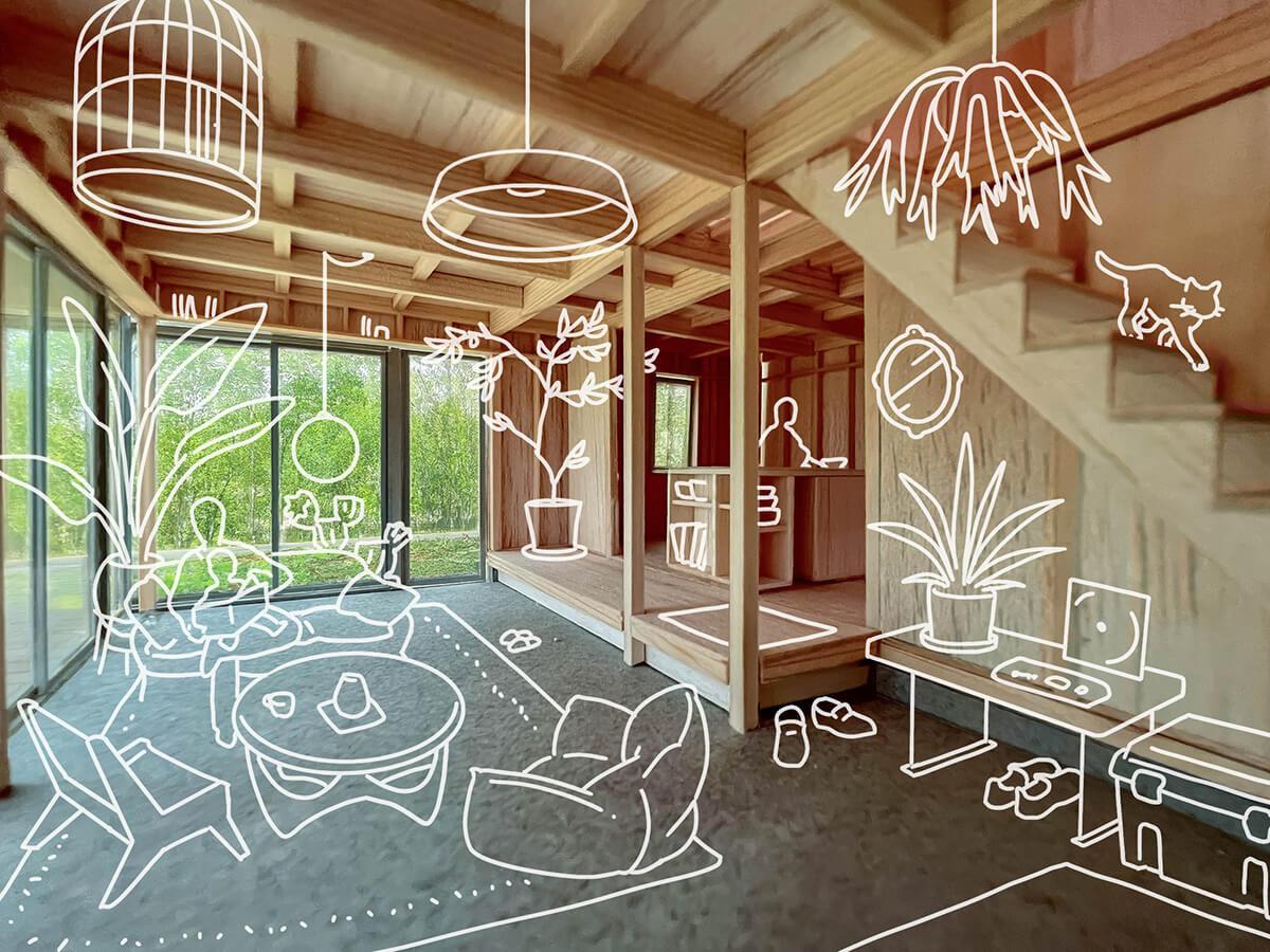 そんな緑の環境を家の中まで取り込めるように、1階に大きな窓のある広い土間が特徴の建物をデザインしました。テラスみたいなリビングや、趣味スペースにしてもいいし、ちょっとオープンにしてもいい。