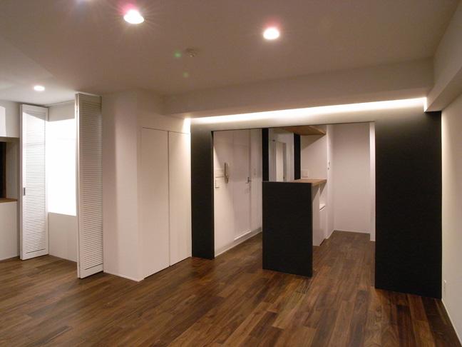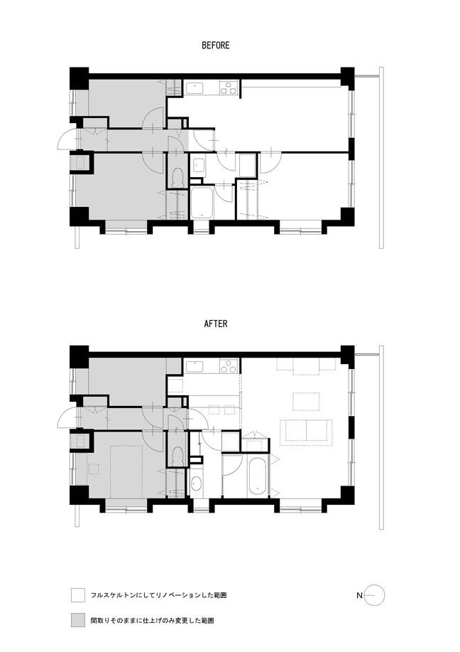 そんな環境のよい住戸だが、購入当初は小さく区切られたありふれた3LDKの間取りだった。巷で売り出されている60平米~80平米ほどの3LDKは、ほとんどこれなのではないかと思ってしまうほど、本当によく見かける間取り。玄関を入ってまっすぐの廊下の左右に個室がふたつ、そこを抜けるとトイレ、洗面、浴室、キッチンなど水廻りがあり、奥にリビングダイニング、その隣にまた個室がある。誰しも一度は訪ねたり、もしくは住んだりしたことのある間取りではないだろうか。