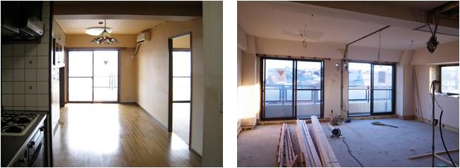 小さく区切られたリビング(解体前)。壁を取り払い1ルームに(解体後)。