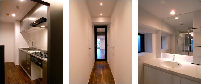 設備機器と収納扉を新しくしたキッチン。既存の古いキッチンを使いながら、見た目も機能も一新。 /廊下は小さな光源で照度の低い照明器具をあえて細かいピッチで配置して、華やかさを出した。ガラス扉で視線も抜けていく。/洗面室。鏡には、浴室とリビングが映っている。