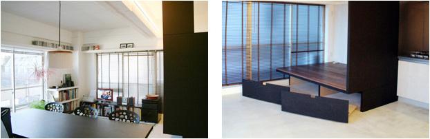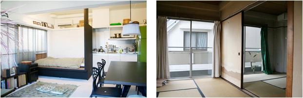 改修後、奥が小上がりとキッチン。改修前は部屋が分かれていた。
