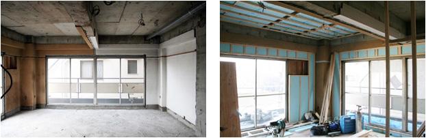 工事が始まったのが冬、とにかく部屋の中が寒い、外より寒い。解体して分かったのだが、この古いマンション、まったく断熱が無かったのだ。天井の上は上階のルーフバルコニーになっているが、壁だけでなくここも断熱が無かった。結局、部屋内側に断熱材を貼付けてから仕上げることにした。10万円ほど、予定外の出費であった。
