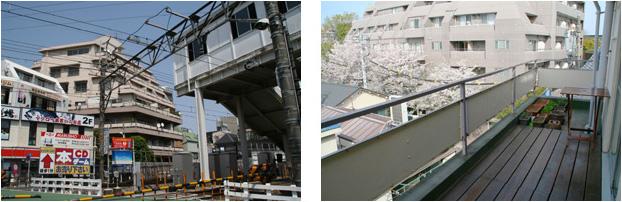 写真中央の建物、駅から徒歩1分。北向きだけど広いバルコニー。