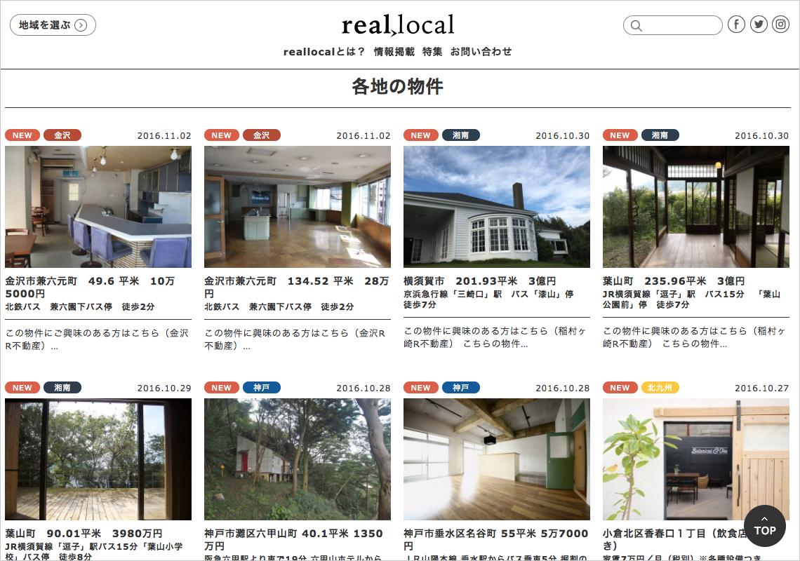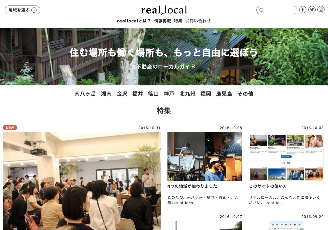 10/8、リニューアルした「real local」のサイト。地域も増え、9都市の物件情報とまち情報が見られるようになった。