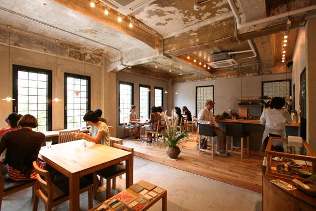 空間はというと、コンクリート剥き出しのままになっている天井と床は、かつての名残り。一段高くなっている奥の床やカウンター、テーブル、椅子などが、温かみのある木で誂えてあって、ホッと落ち着く。席と席がほどよく離れているので、ゆったりリラックスして過ごせるのもポイント。お一人様でも居心地がいい。
