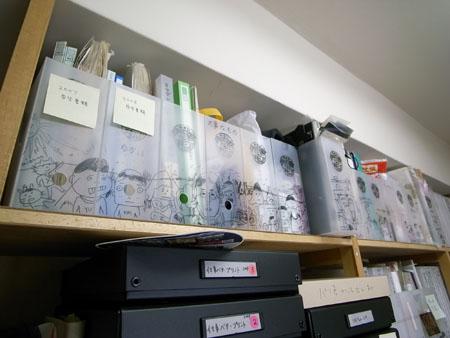 無印良品のファイルボックスにかわいいイラストが。漫画の背表紙のように絵が繋がっています。