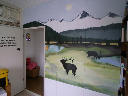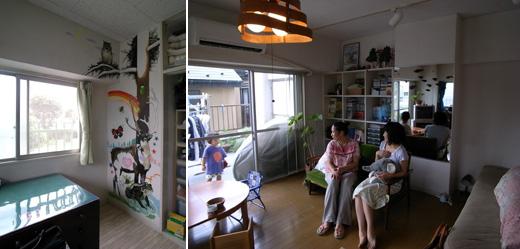 (左)壁画はKさんの友人のイラストレーターさんに描いてもらったとか。(右)向かって右側に座っていらっしゃるのがオーナーSさん、左側に座っていらっしゃるのが入居者のKさん。