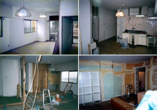 (左上)洋室と和室に分けられた、小分けの間取りでした。(右上)キッチンはこんな感じでした。(左下)壁をぶち抜いて広々と開放感のある間取りに。(右下)以上がbefore。