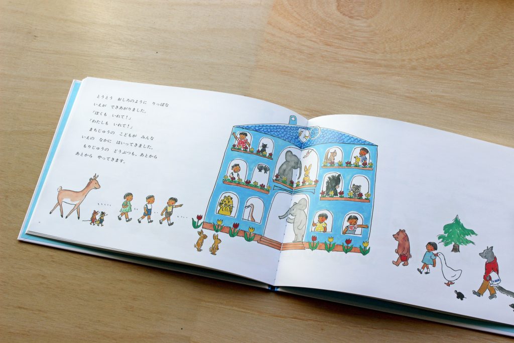 ちなみに最後にきつねがやってきて、飛行機を返すから家はぼくのものだ!とひとりじめ。すると翌朝「そらいろのいえ」はなくなってしまう。まちの開発も、ひとりがおいしい思いをするつくり方じゃなくて、みんなが協力しあってつくっていこう。